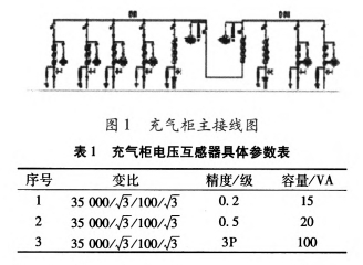 變電站位于高原地區(qū),海拔2100m。變電站選用某公司出產(chǎn)的35kV中壓充氣柜。主接線如圖1所示,其間電壓互感器型號為JDZx-35(A、B、C)型,具體參數(shù)如表1。
