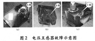 2012年3月26日,檢修人員連夜對35kV垣潔線56號線路電壓互感器進(jìn)行撤除查看,發(fā)現(xiàn)電壓互感器A、B、C相損壞,A、B相有迸裂現(xiàn)象;B相PT損害嚴(yán)峻,側(cè)壁脫離本體,插頭墜落,繞組完全毀損;A相PT插頭墜落,外表漆層及噴鋁層受損;C相外表漆層及噴鋁層受損,其它部位正常,如圖2所示。