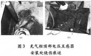 查看35kV垣潔線56號線路電壓互感器上端柜頂,發(fā)現(xiàn)柜頂插拔處燒損,斷路器室壓力開釋設(shè)備動作。將壓力開釋通道翻開后,發(fā)現(xiàn)本柜斷路器室壓力開釋盤動作,壓力開釋通道有許多燃弧噴出的落塵。翻開斷路器室入孔后,發(fā)現(xiàn)氣室內(nèi)有燃弧痕跡。氣室內(nèi)其它絕緣件未受損,銅排和充氣柜柜體外表有落塵無燒傷痕跡,如圖3所示。